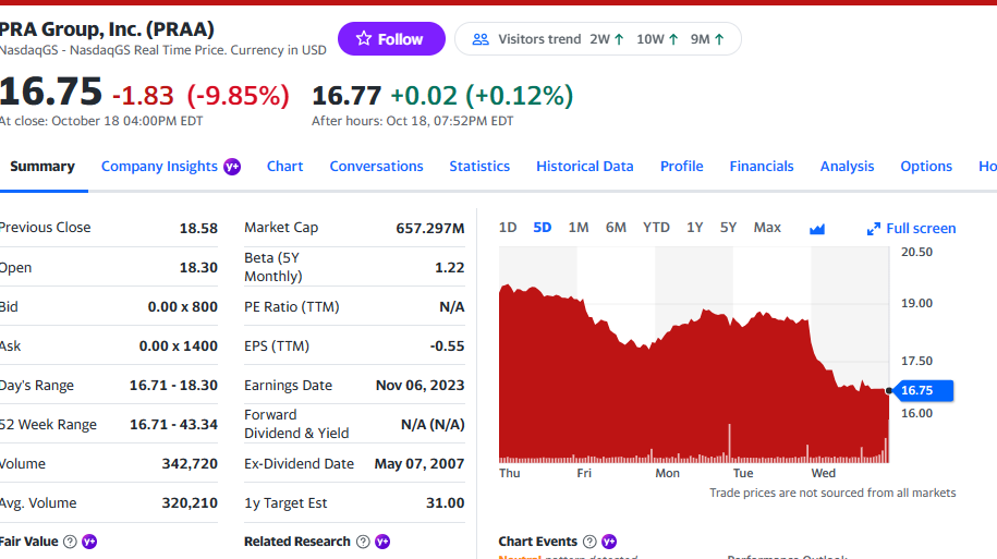 I’m musing on PRA’s financial health as I prepare for appeal and hopefully trial, and watching as the price of PRAA stock tries to push down through the $17.74 ten-year floor.