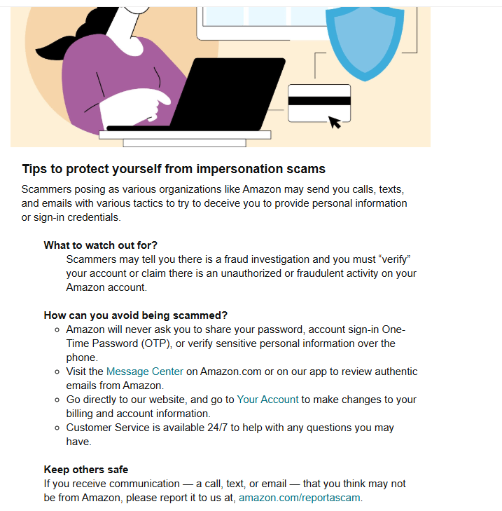 Amazon warns the public of two scams. Scammers may claim there is a fraud investigation and that you must “verify” your account. Or the scammer may claim there is unauthorized or fraudulent activity on your Amazon account. Amazon suggests that you don’t “verify sensitive personal information over the phone.”