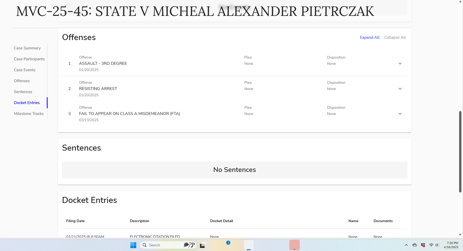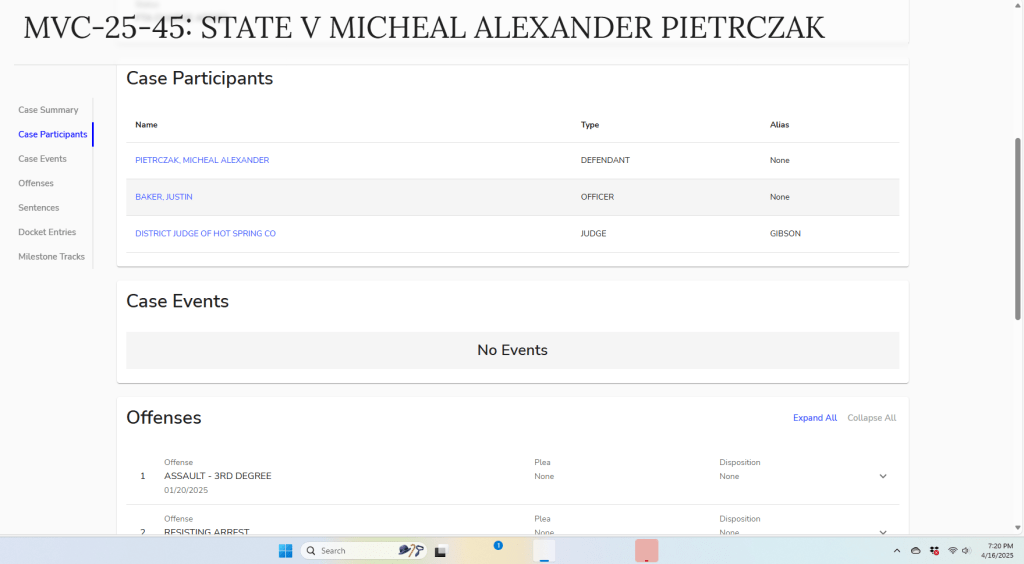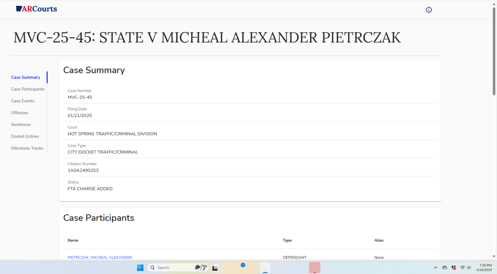 When I looked at the electronic record, things got even more suspicious. The official citation from January 21, 2025 spells Micheal’s first name correctly—but the citation lists the wrong birth year: 1972 instead of 1973. Pietrczak’s prior rap sheet was altered to show his name as “Michael”. According to the district court clerk, this information comes straight from the DMV. What caused this? No one will tell me, but here is an educated guess:
